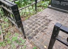 Это одна из ранее выполненных нами работ. Мы устанавливали общую подставку, левый памятник, укладывали брусчатку и монтировали ограждение. На участке было проведено дозахоронение урны, брусчатку вскрывали. Клиент, повторно обратившись к нам, заказал восстановление брусчатки и новую надпись с портретом на памятнике. Первое фото отражает исходное состояние места захоронения.